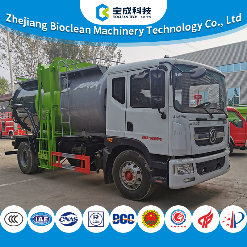 ★The interior of the carriage is divided into an upper solid storage compartment and a lower liquid storage compartment, and the kitchen waste is squeezed by an internal pushing mechanism to achieve solid-liquid separation. After being transported to the processing site, the liquid is discharged through the lower pipeline, and the solid is discharged from the rear through the pushing mechanism