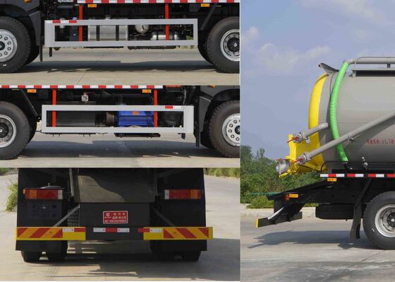 Choose a 3360mm chassis wheelbase; The vehicle is equipped with specialized devices such as tanks and vacuum systems for the collection and cleaning of feces and sewage; Dimensions of the tank body (diameter x length) (mm): 1400 x 3692 (including head); The total capacity of the tank is 4.77 cubic meters, and the effective volume of the tank is 4.58 cubic meters; When the vehicle is equipped with an optional arm support device, the overall height of the vehicle is 2605mm, and when equipped with no arm device as standard, the overall height of the vehicle is 2590mm; The car can also be equipped with liquid level switch, manhole cover style, sewage outlet style, anti overflow valve style, water tank, pipeline, camera, installation position and pipeline layout of liquid level gauge, pipeline layout, liquid level gauge style, left/right bottom beam layout; The side protection material is Q235A, connected by bolts. The rear protection material is Q235A, connected by bolts. The cross-sectional size of the rear protection device is 120 × 60mm or 100 × 50mm, with a ground clearance of 405mm; Equipped with ABS on the chassis, ABS model/manufacturer: CM4XL-4S/4M/Guangzhou Ruili Kemi Automotive Electronics Co., Ltd